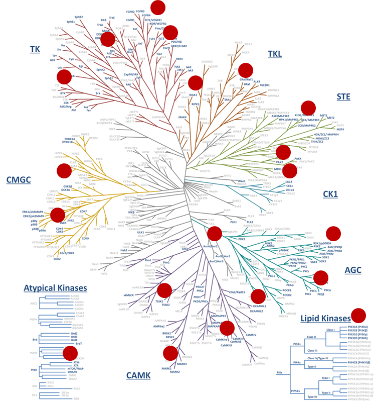 Kinases play essential roles in cell signal transduction, thereby regulating various physiological functions of cells; therefore, kinases are an essential drug target for many diseases. ChemPartner’s in vitro biology team has established nearly 200 kinase assays by using the world’s leading technologies and instruments, which cover the majority of kinase targets from various kinase subfamilies. The established kinase panel provides the comprehensive assay support for kinase drug discovery.