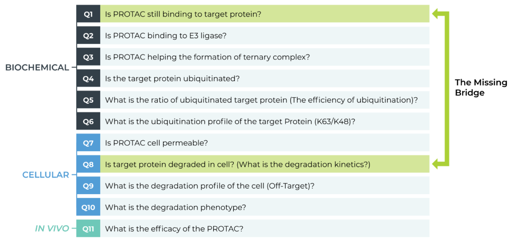 - (Q7) The final key question – whether the PROTAC is cell permeable – is answered using cell uptake assay and NanoBRET assay to confirm target engagement.