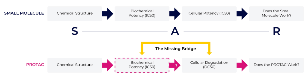 For PROTACs, SAR is far more challenging than for traditional small-molecule inhibitors, as biochemical and cellular data links remain unclear. Western blot can assess degradation efficacy, but a wide “missing bridge” gap exists between target binding and degradation. PROTACs’ complexity demands robust assays to connect these data points.
