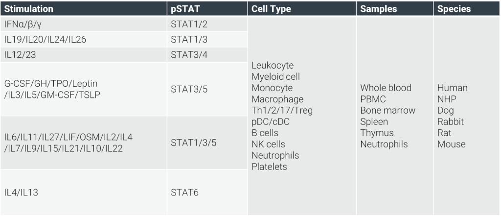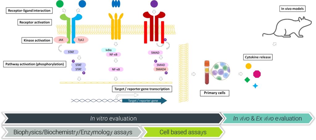 Intracellular Downstream Signaling: Kinase assays target JAK/TYK, while STAT-DNA binding and phosphorylation in cell lines (e.g., IL-4-pSTAT6) deliver precise readouts, supported by luminescence, MSD, and FACS.