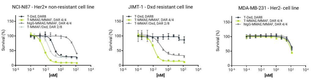 Cytotoxic activity of trastuzumab ADCs across HER2+ and HER2– cell lines. In HER2+ non‑resistant cells, all trastuzumab ADCs induced cell death. In contrast, in DXd‑resistant HER2+ cells, cytotoxicity was observed only with the dual‑payload ADC. No activity was detected in HER2– control cell lines, consistent with target‑dependent effects.