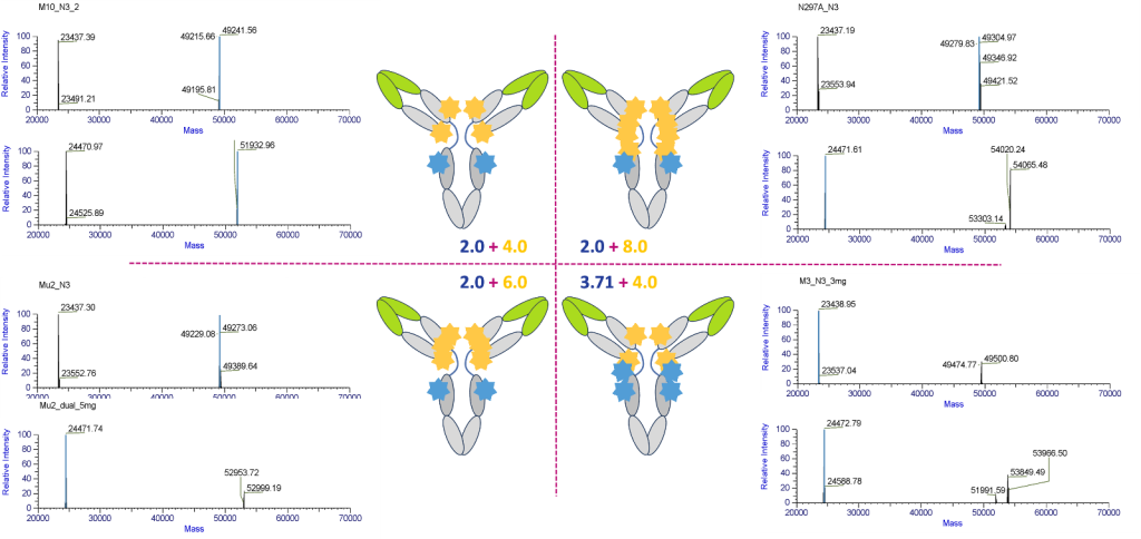 Demonstration of controlled ADC engineering. Clean mass spectrometry profiles confirm the generation of single, well-defined conjugate species with predictable DARs.