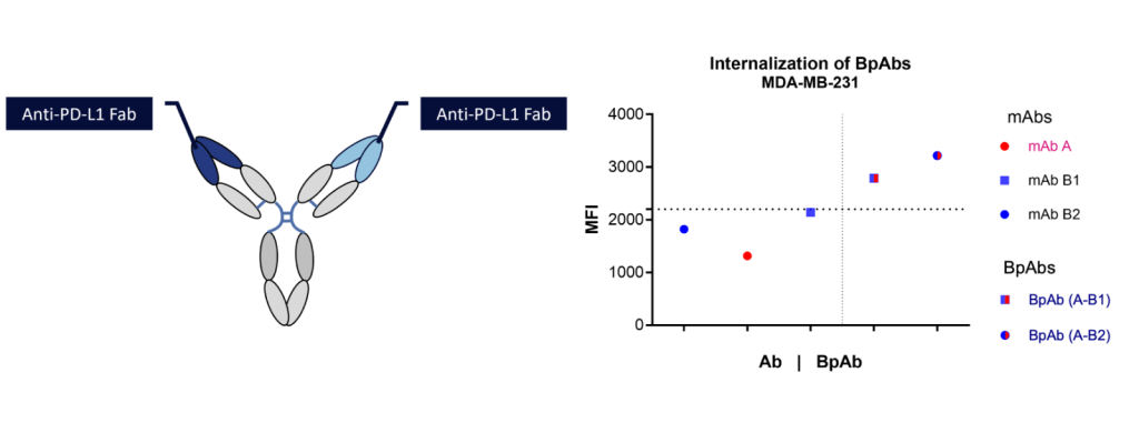 Biparatopic ADC structure and internalization in MDA-MB-231, breast cancer cell line. BpADCs showed better internalization compared to the parental mAbs.
