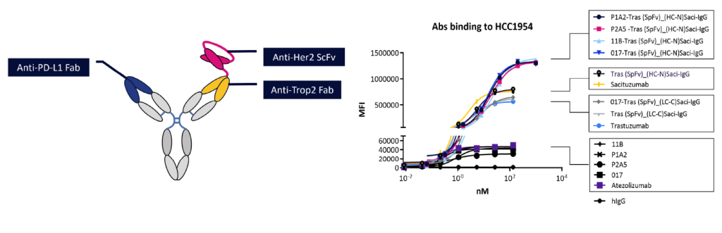 HER2×TROP2xPD-L1 trispecific ADC structure and binding to HCC1954, an epithelial breast cancer cell line. The ADC demonstrated a stronger binding when compared to the parental monoclonal & monospecific antibodies (mAbs).