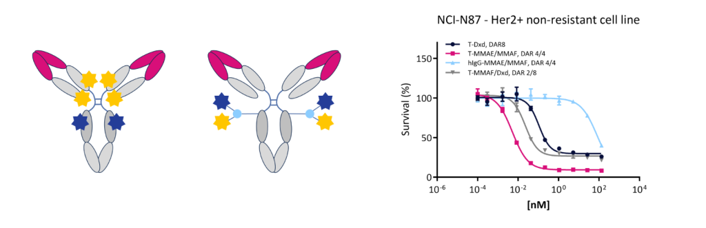 We can engineer multiple configurations of dual payload ADCs, either multi- or single site, branched linker. We validated multiple configurations on cytotoxic assays, testing different DARs.
