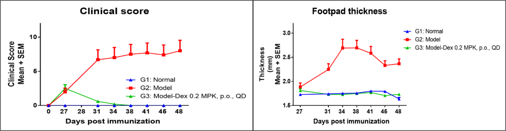 Preclinical animal studies are crucial in understanding of mechanism of action of an investigated compound, especially in such complex diseases as autoimmune arthritis. They are critical to establish new drug potency, efficacy and safety before progressing into clinical trials. One of the most useful models used in preclinical safety in rodents are collagen induced arthritis (CIA) and adjuvant induced arthritis (AIA).