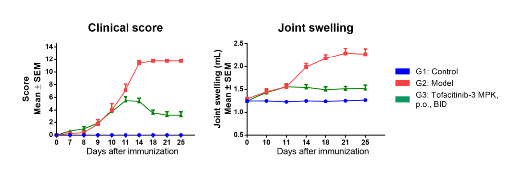 Also, both clinical score and joint swelling show model relevancy for RA and responsiveness to tofacitinib, a Janus kinase (JAK) inhibitor.
