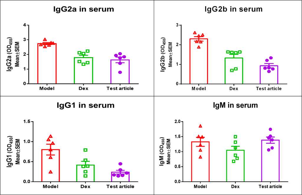 Rat CIA model was used to test an experimental compound. Dexamethasone was used as a control anti-inflammatory agent. Below are the results from cytokine and IgG panels.