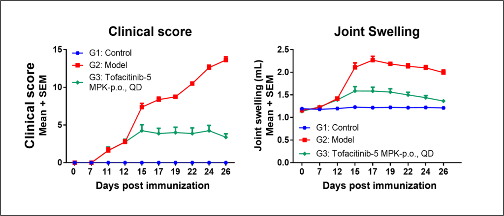 Both clinical score and joint swelling show model relevancy for RA and responsiveness to tofacitinib, a Janus kinase (JAK) inhibitor.
