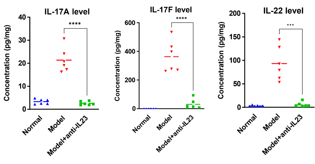 Our cytokine release assay confirms pathway activation of the key effector interleukins – IL-17 and IL-22 – induced by the injection of IL-23, and displays inhibitory effect of anti-IL-23 antibody