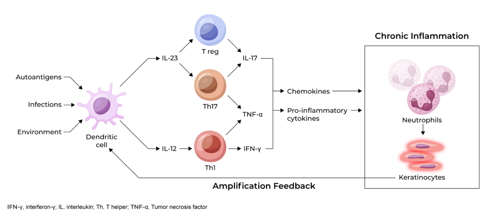 Psoriasis pathogenesis. Inflammatory myeloid dendritic cells release IL-23 and IL-12 to activate T cells to produce psoriatic cytokines, with IL-17 being identified as one of the main effector cytokines in psoriasis. These cytokines cause additional chemokine flooding and inflammatory effects on keratinocytes, which further increase dendritic cell activity, closing the loop of self-amplifying chronicity [5]
