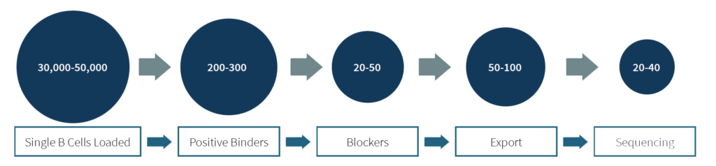 - Identify plasma B cells from immunized mice with target specific binding and functional activity