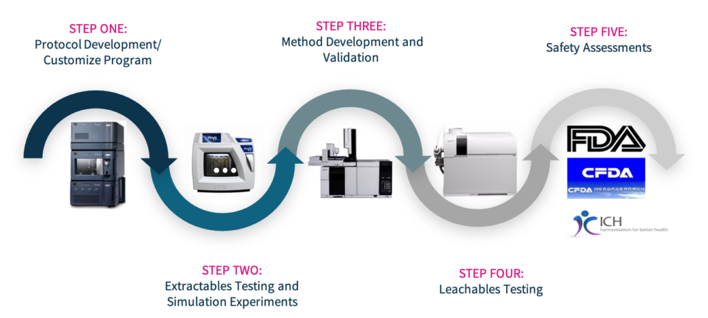 • Extractables and leachables studies using various platforms of GC-FID, GC-MS-MS, ICP-MS, LC-MS-MS, and UPLC, etc.