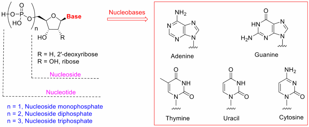 Nucleic acids (DNA) are the carriers of genetic information. The central dogma depicts that genetic information (genes) stored in DNA are transcribed into RNA which are then decoded to translate into proteins. A nucleic acid is an oligonucleotide sequence that is formed by polymerization of nucleoside monomers via a phosphate bridge. A typical nucleoside consists of a sugar moiety and a nucleobase moiety which are linked via a glycosidic bond.