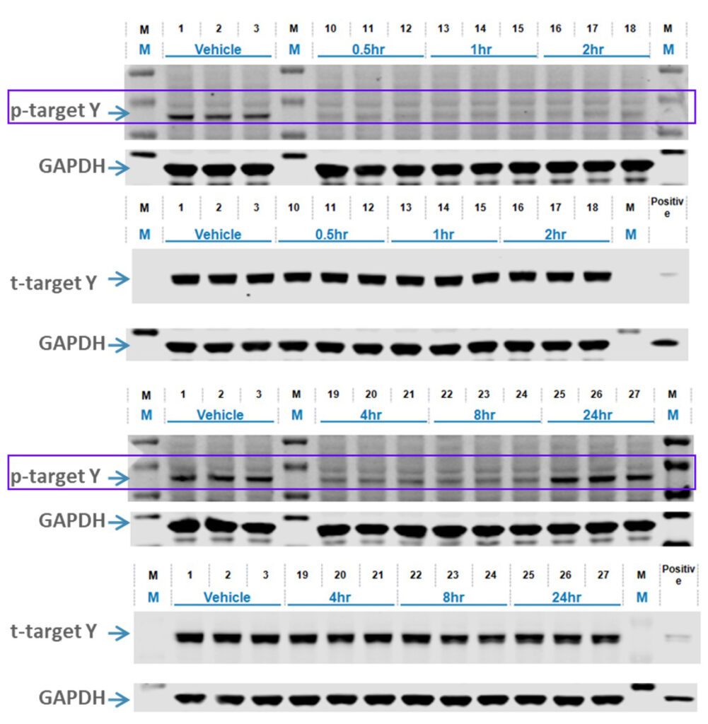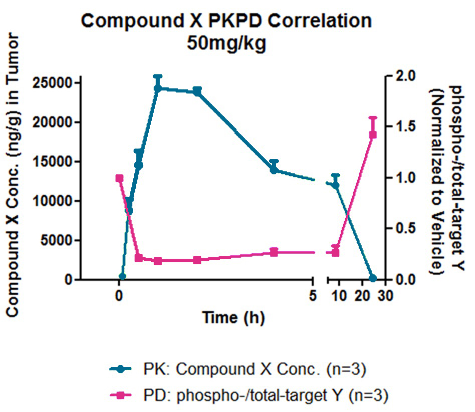 Phosphorylation of downstream target Y (PD marker) inversely correlated with the concentration of Compound X in the tumor (PK)