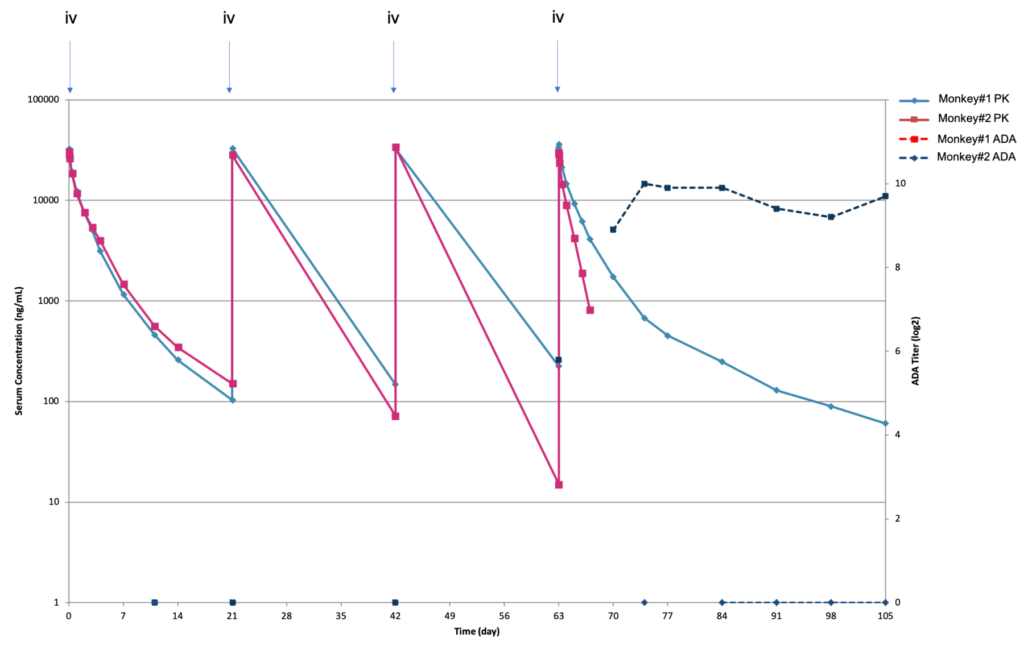 We evaluate drug immunogenicity and its impact on PK and PD by measuring ADA levels with a tiered approach (screening assay followed by a confirmatory assay).