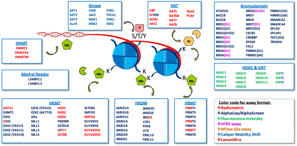 The molecular basis of epigenetics, the study of heritable phenotype changes that do not involve alterations in the DNA sequence, mainly includes the modification of DNA and histones, which lead to the up-regulation or down-regulation of the related gene expression. It is an important part of regulating the cell life cycle. In addition to genomics, epigenetics provides further understanding for development, aging, and many diseases. Moreover, epigenetic targets open up a broader space for new drug discovery. ChemPartner’s in vitro biology team has exclusively developed more than 100 epigenetic enzymatic assays, which fully cover histone methylation and demethylation, histone acetylation and deacetylation, DNA methylation, and methylation/acetylation reader proteins. The established epigenetic enzyme panel provides comprehensive assay support for early drug discovery.