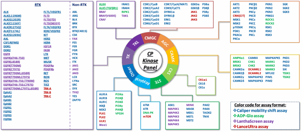Kinases play essential roles in cell signal transduction, thereby regulating various physiological functions of cells; therefore, kinases are an essential drug target for many diseases. ChemPartner’s in vitro biology team has established nearly 200 kinase assays by using the world’s leading technologies and instruments, which cover the majority of kinase targets from various kinase subfamilies. The established kinase panel provides the comprehensive assay support for kinase drug discovery.